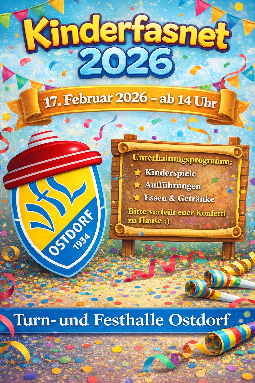 Am 17.02.2026 ab 14 Uhr ist es wieder so weit – wir feiern gemeinsam Kinderfasnet in der Turn- und Festhalle Ostdorf